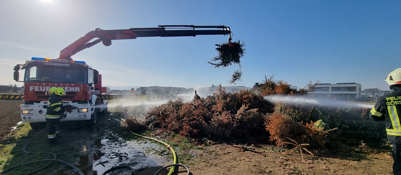 Beim Eintreffen am Einsatzort war ein großer Holzhaufen in Brand. Es handelt sich um einen Lagerplatz für Christbäume. Die Feuerwehr Hausmannstätten war bereits vor Ort.